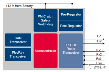 NXP 的 TEF810X 是完全集成的单片 rfcmos77GHz 汽车 FMCW 雷达收发机,该设备适用于 76-81ghz 全自动雷达频段的短、中、远程雷达应用。TEF810X 雷达收发机是一种集 3 台发射机、4 台接收机、模数转换器和低相位噪声压控振荡器(VCO)于一体的低功耗雷达收发机。