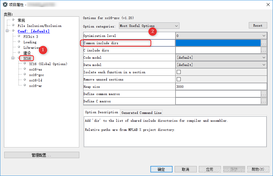 1、打开菜单 文件项目属性,弹出项目属性对话框。点击 XC16,编辑 Common include dirs。