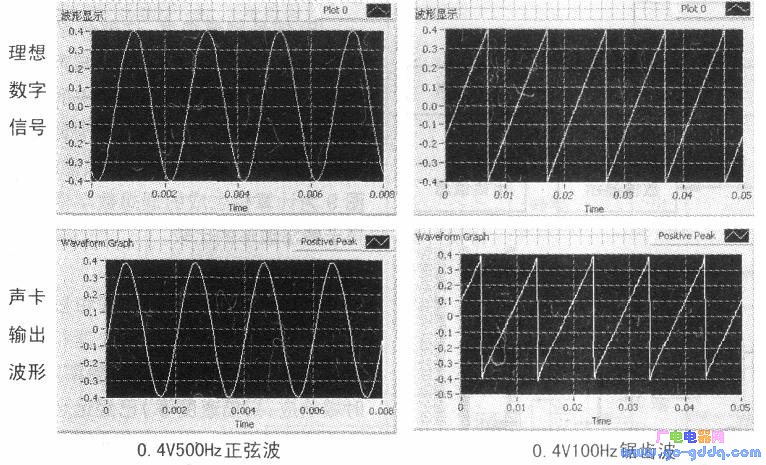 下图为计算机生成的理想数字信号与声卡输出波形的比较。