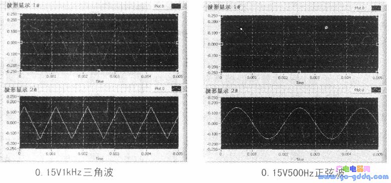 在信号采集时,信号格式设置为“stereo.16bit",从而实现16位转换精度的双通道输入。采样频率视所要观察的信号频率而定;缓存器容量要设为2的倍数,以提高计算机运算效率,每通道采样点数=缓存器容量/4。采样所得信号为二维数组,要先将其转换成一维数组,然后再分离成两个通道的信号。信号数据经精度转换后,一方面用于数值显示,另一方面生成波形,由示波器显示。由于声卡通道的差异,对采集信号的放大倍数不同,因此需要对两通道数据进行不同的处理。