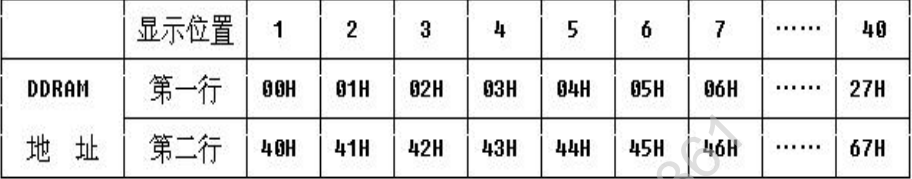 在设置完成之后我们就要明白具体是在哪个位置显示。在对液晶模块的初始化中要先设置其显示模式, 在液晶模块显示字符时光标是自动右移的, 无需人工干预。 每次输入指令前都要判断液晶模块是否处于忙的状态。DDRAM 就是显示数据 RAM ,用来寄存待显示的字符代码。共 80 个字节,其地址和屏幕的对应关系如下表:
