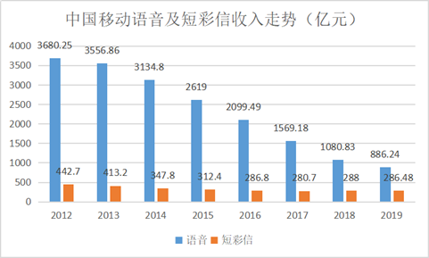 以中国移动为例,从2012年至今,其语音和短信业务收入几乎处于连年下滑的态势。语音收入从2012年的3680.25亿元下降至2019年的886.24亿元;短彩信业务收入从2012年的442.7亿元下降至2019年的286.48亿元。
