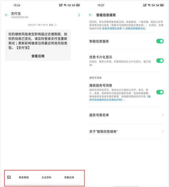 实际上,运营商此前已经和一些手机厂商在推动智能信息/增强信息服务,在一些简单功能上实现了5G消息的雏形。比如在支付宝的短信界面,下方就具有联系客服、企业百科、查看应用这三个功能,比传统短信在功能和交互上是相对丰富一些。