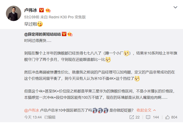 今(21)日午间,有数码博主@小米副总裁卢伟冰发问:米10中国区破百万了吗?卢伟冰则回复道:早过啦。