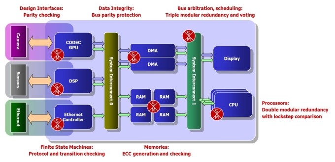 对于设计接口,可以执行奇偶校验,以确保在设计内部的接口模块和接口控制器之间进行准确的数据传输。一旦数据在设计中,就可以通过总线上的数据奇偶性和存储元素中的错误纠正代码(ECC)来保护它们。片上总线事务可以由专用总线监视器观察。关键控制组件,如功能安全机制和仲裁逻辑,将最好的保护三重模块冗余和多数表决。中央处理器和嵌入式处理器可以通过双模块冗余和锁步检查器来保护。