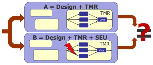 在下图中,使用三模冗余(TMR)[1]作为安全机制来保护设计。通过比较设计A(无安全机构)和设计B(有TMR), SLEC可以从数学上证明TMR已经正确地插入到设计中。由于功能仿真只能模拟有限数量的输入序列来验证TMR的运行,因此该方法具有较高可信度。