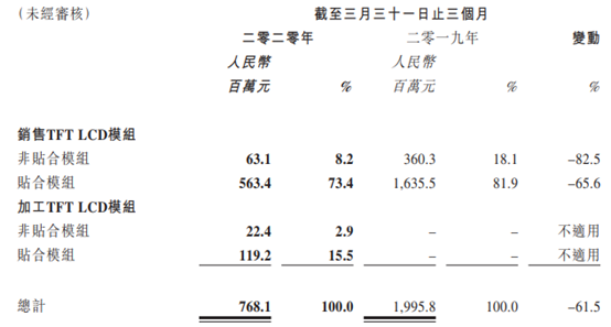 华显光电自2019年6月提供LCD模块加工服务,由于该等产品相比销售LCD模块(其销售单价包含产品成本因而高于加工费)仅收取加工费,故营业额下降至人民币768百万元,同比下降61.5%。非加工类产品中, 贴合LCD模块产品营业额为人民币563百万元,同比下降65.6%;非贴合LCD模块产品营业额为人民币63百万元,同比下降82.5%。