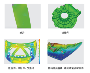 蓝光协作现场自动化测量方案具有高效、安全、适应性强等诸多特点,适用于铸造件、钣金件、冲压件、加强件、塑料件及模具、碳纤维复合材料件、叶片等不同零件的高精度测量。