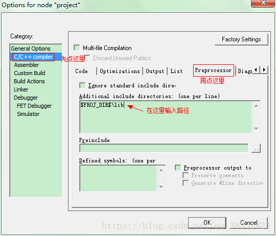 选择C/C++ compiler,然后再选择Preprocessor,最后在下面的空格处写上相应的路径,路径的格式在后面有专门介绍。如下图: