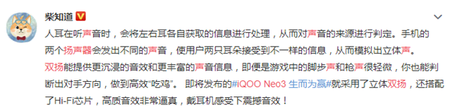 网友在对iQOO Neo3音质测评后,给出了颇高的评价。博主@柴知道在进行技术解读时表示:“人耳在听声音时,会将左右耳各自获取的信息进行处理,从而对声音的来源进行判定。手机的两个扬声器会发出不同的声音,使用户两只耳朵接受到不一样的信息,从而模拟出立体声。双扬能提供更沉浸的音效和更丰富的声音信息,即便是游戏中的脚步声和枪声很轻微,你也能判断出对手方向,做到高效‘吃鸡’。”