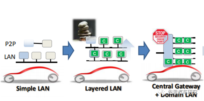 随着汽车新四化发展,传统分布式 E/E 架构受到挑战:EV 的三电系统,增加了汽车 E/E 架构的复杂程度;智能座舱、自动驾驶等功能,需要融合更多传感器数据,对 OTA、算力和车辆安全等提出更多挑战。因此,未来汽车需要更高算力的 ECU 协同以及可拓展性的架构设计,域集中电子电气架构、车辆集中电子电气架构等对现有分布式架构的替代作用将逐渐显现,车企和 Tier1 争相进行前瞻布局。 丰田电子电气架构开发部总经理 Nishikawa 总结的电子电气架构演进路线为:简单 LAN→分层 LAN→中央网关+域 LAN→计算平台(包括在线云)→计算平台++(包括在线云、线下云)。