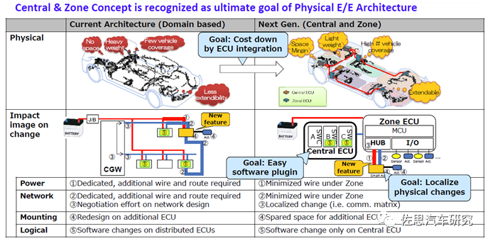丰田在未来电子电气架构中,则将采取 Central& Zone 的 E/E 方案。