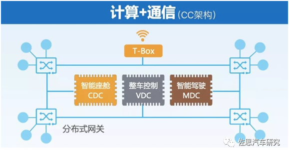 • 华为提出基于计算和通信的 CC 架构,由分布式网络和三大域控制器构成。
