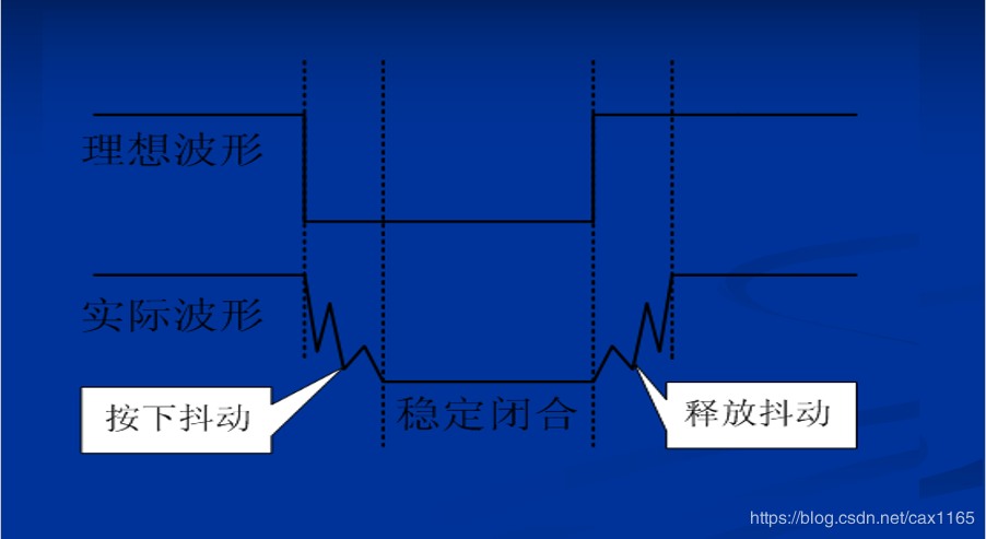 当K1按下时,由于独立键盘的物理特性以及按下过程等因素的干扰,P3^1口电平变化与理想情况并不相符,出现“抖动”现象,如下图所示: