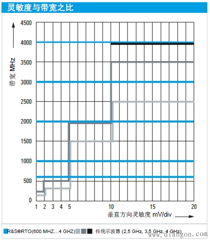 图 3:R&S®RTO 示波器采用 A/D 转换器高度一致的 ENOB,确保精确显示和最大动态范围。这就是为什么在 R&S®RTO示波器开发中采用最严格的设计要求的原因。努力终有回报:在同类仪器中,哪怕把灵敏度调到最高,我们的 R&S®RTO 示波器内部噪声都是最低的,可以提供最准确稳定的测试结果(参见图 4)