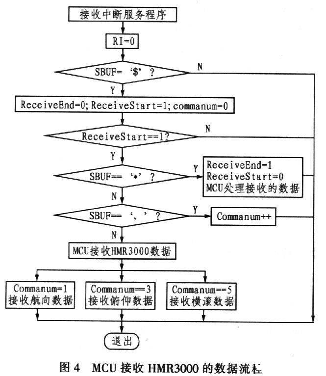 启动HMR3000后,设定好HMR3000的数据单位、进制及其数据采集速率,每次数据采集后HMR3000自动向MCU发送数据。由于它采用NMEA0183协议标准的HPR格式即“$PTNTHPR,x..x,a,x..x,a,x..x,a*hh”格式输出,此格式中不仅含有效数据“x..x”和其状态“a”,还包含有‘$’、‘P’、‘T’、‘*’、‘h’等相关格式字符,因此在程序中要加以区分。动感系统中将字符‘$’作为一组有效数据传输的开始,将字符‘*’作为一组有效数据传输的结束,并通过计算接收逗号‘,’的个数判断有效数据的开始。MCU接收HMR3000的数据流程如图4所示。