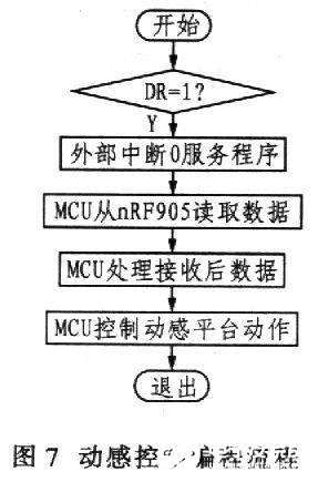 根据硬件电路的连接,可以利用外部中断0服务程序实现动感的实时控制,这样,MCU在DR变成高电平后即可控制动感平台动作,提高了实效性。程序流程如图7所示。
