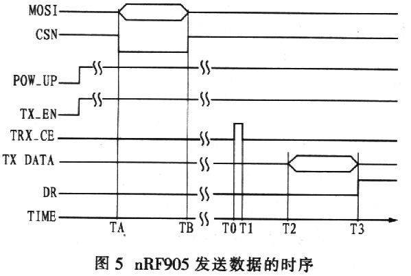 nRF905的发送时序如图5所示,其中.TA-TB是nRF905的命令字寄存器、匹配地址寄存器和发送数据寄存器编程时间;TD-Tl是发送启动脉冲,至少为10μs;T1-T2是nRF905的自动编码,至少为650 μs;T2-T3是自动发送数据;T3是发送结束时DR置高电平,表示发送结束。具体步骤如下:
