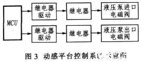 动感平台是动感系统的执行部分,它由6个液压泵和模拟驾驶室的底板构成。其工作原理是MCU根据传来的动感数据通过继电器驱动电路控制相应继电器,使相应液压泵的相应电磁阀开启或闭合,进而模拟驾驶室上下颠簸、前后俯仰或左右摇摆,如图3所示。