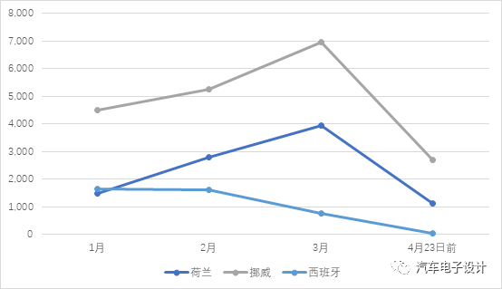 西班牙的状态进入 4 月份新能源汽车基本进入停滞状态,处在归零状态,所以看到的销量都是个位数。我相信意大利和法国的情况应该很相似,法国基数大一些但是应该也不会很高。