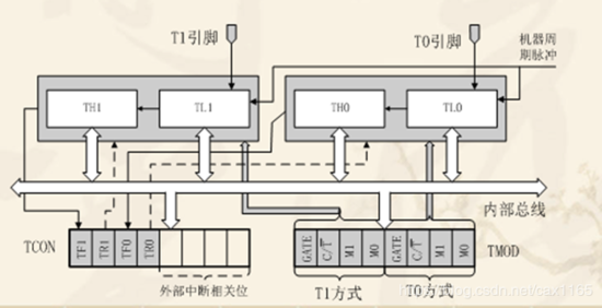 定时/计数器的实质是加1计数器(16位),由高8位和低8位两个寄存器THx和TLx组成。