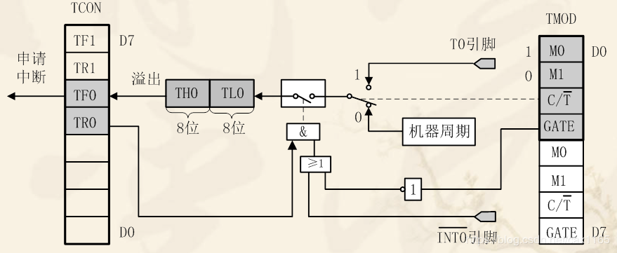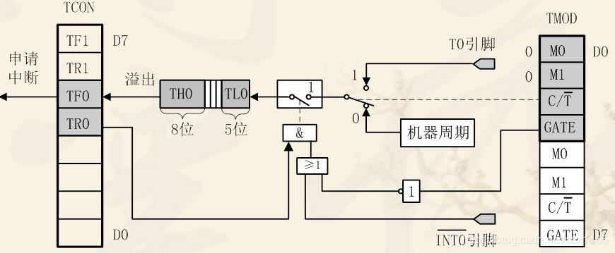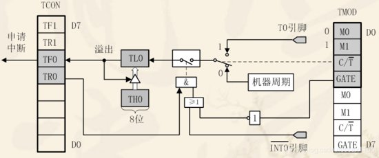 方式0为13位计数,由TL0的低5位(高3位未用)和TH0的8位组成。TL0的低5位溢出时向TH0进位,TH0溢出时,置位TCON中的TF0标志,向CPU发出中断请求。