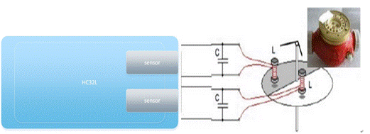 当对该LC电路充电后,MCU通过检测固定电容C两端的电压,可以获得LC振荡电路中的正弦波。当电感线圈处于金属区,会形成电感涡流,导致更大的电能消耗,正弦波衰减速度更快;当电感线圈处于非金属区,基本不存在涡流,正弦波衰减速度相对较慢。通过MCU来检测正弦波衰减的快慢,可以准确识别出表盘转子处于哪个区域,进而判断表盘位置及圈数,达到水表计量的目的。