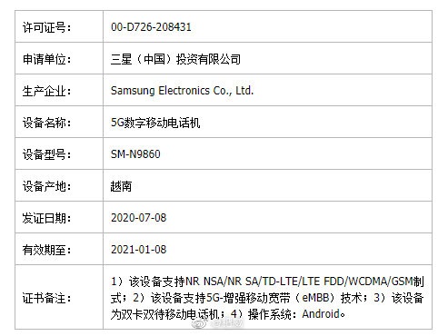 入网信息还显示,这款手机的型号是SM-N9860,支持5G,产地是越南,目前工信部网站还未公布该机的更多信息。