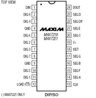 MAX7219的引脚排列如图所示,各引脚功能叙述如下: