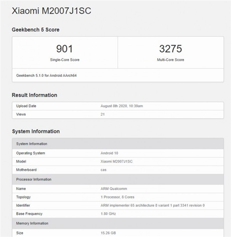 近日,名为小米M2007J1SC的设备现身Geekbench数据库,有消息称该机就是小米10至尊纪念版,单核901,多核3275,最高16GB RAM,运行Android 10系统等。