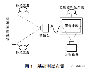 MTF 值、SNR、动态范围、最高照度、最低照度、自动增益、白平衡、色彩还原均采用如图 1 所示的基础测试布置,取得不同光照条件(光源类型与照度)下拍摄不同图卡的图像进行色度、亮度以及调制传递函数方面的数字解像;