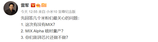8月9日,雷军在微博上回复了几个米粉们最关心的问题,包括这次有没有 MIX、MIX Alpha 啥时量产、你们澎湃芯片还做不做等。