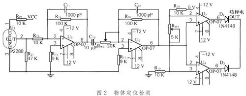 信号探测采用被动式双元热释电红外传感器P2288,并在其表面罩上一个菲涅耳透镜用来提高其探测灵敏度。它以非接触形式检测出人体及车辆放射出的微弱红外线能量并转化成电信号输出,物体定位检测电路如图2所示。当P2288探测到有人或者车辆进入到探测区域,P2288产生一个交变红外辐射信号,并输出一个微弱的电压信号(TTL电平)。