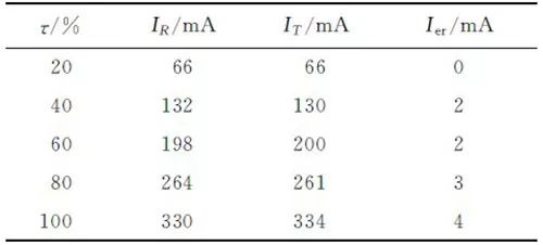 测试恒流源驱动电路的时候选用1 W 的大功率LED灯珠,通过调节PWM 的占空比来检测通过LED的电流值。如果LED亮暗的频率超过100Hz,人眼看到的就是平均亮度,而不是LED的闪烁。实验仿真设定PWM 输出信号的频率为1kHz,实验仿真结果如表2所示。从表2看出,恒流源的误差精度在±4mA,LED的工作电流与PWM 输出信号的占空比成正比关系。恒流源驱动电路虽然简单,但其性能非常优秀。