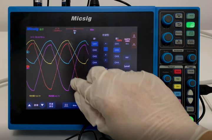 如下图通道一(黄色)和通道二(蓝色)分别测量的是零线和火线,通道三(粉色)是直接采用差分探头测出的市电波形,通过示波器数学通道(红色)相减后也可以得出市电波形。
