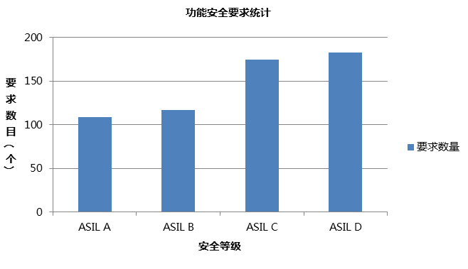 ISO26262 对关键的安全级别进行了四层划分,通过汽车安全完整性等级(ASIL)来衡量。ASIL A 是最低等级,要求数目约 100 个左右,而 ASIL D 是最高等级,要求数目近 200 个。等级越高,安全系统就需要提供越多的安全和验证措施,需要增加更多的测试和集成工作,也就意味着供应商需要承担更多的开发成本和时间。