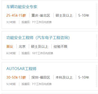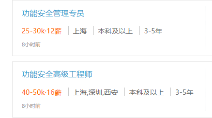 随着新能源汽车行业的快速发展以及企业对新能源汽车安全越来越重视,越来越多的企业会进行功能安全认证,而通过功能安全认证的必要条件就是必须有经过功能安全培训并获得功能安全工程师的证书的工程师。所以,功能安全工程师越来越受到重视,经过培训并获得证书的开发工程师以及其他工程师就业上都会更受到青睐。招聘网上对功能安全方面的需求众多且待遇不菲。