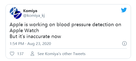 爆料人Komiya称,血压检测不会成为将在今年晚些时候推出的Apple Watch Series 6中的一个功能,因为现阶段它 “非常不准确”。