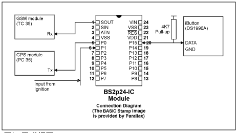 该设计的核心是 BASIC Stamp,它把 GPS 接收机、GSM 调制解调器、iButton 及汽车点火器检测有机的连接在一起,构成一个完整的系统。