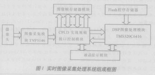 本系统由模拟摄像头采集视频数据,通过视频解码芯片将模拟视频信号转换为数字视频信号。CPLD 作为采样控制器,完成数字视频数据的存储和时序控制。本设计选用 TMS320C6416 实现系统控制和数据处理。具体组成如图 1 所示。
