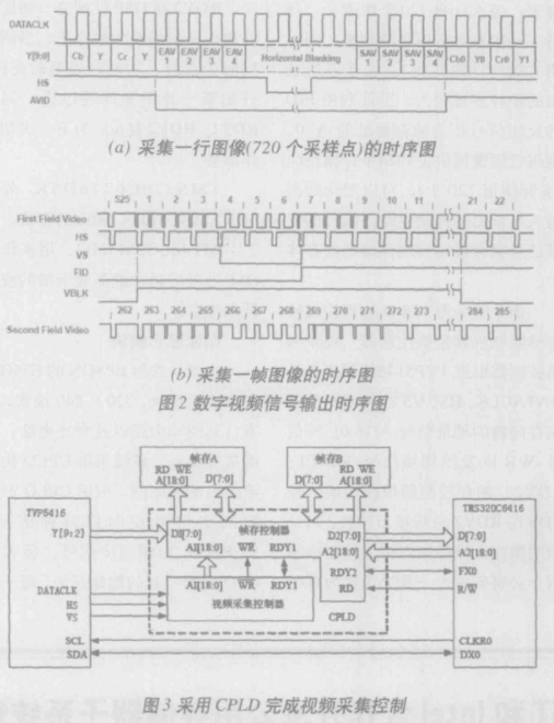 数字视频信号按图 2 所示时序输出。以 NTSC 制为例,图中 Y[9:0]为输出的亮度视频信号,DATACLK 为行锁定系统的输出时钟,为像素时钟频率的两倍,即 27MHz,用来同步数据采集,HS 为行同步信号,VS 为场同步信号,VBLK 为场消隐信号,FID 为奇偶场信号。HS 的高电平表示一行有效采样点 720 个,VS 的高电平表示一场有效信号,对于 NTSC 制信号,单场为 243 行,奇偶场信号 FID 为“1”时,表示当前为奇数场, 为“0”表示偶数场。