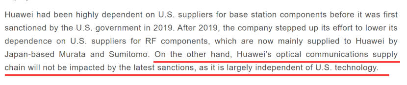 非常值得注意的是,最后一段涉及5G芯片问题时,TrendForce认为华为的天罡芯片有可能会受到新一轮禁令的制裁(该芯片主要由台积电代工),但华为的光通信供应链(optical communications supply chain)乃是华为的一个“绝技”,基本不会受到美国制裁的影响。