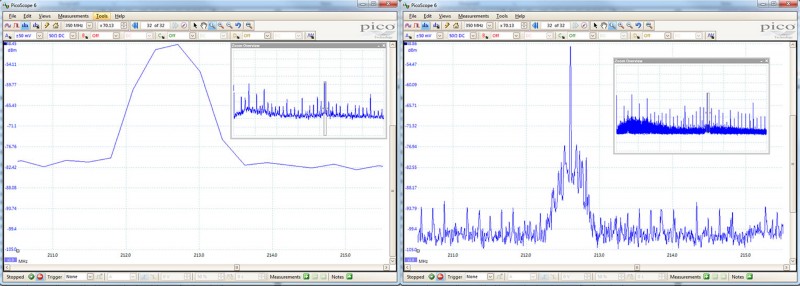 另外,为了提高水平方向的细节,更长的FFT长度可以降低噪声。如果你想要把示波器来进行频谱分析,那么更长的FFT长度将助你一臂之力。就像在图1中显示的那样,是用控制板的磁性探头来进行FFT。在这里我放大了频谱的一部分,左边是2048个点的,右边有131072个点。