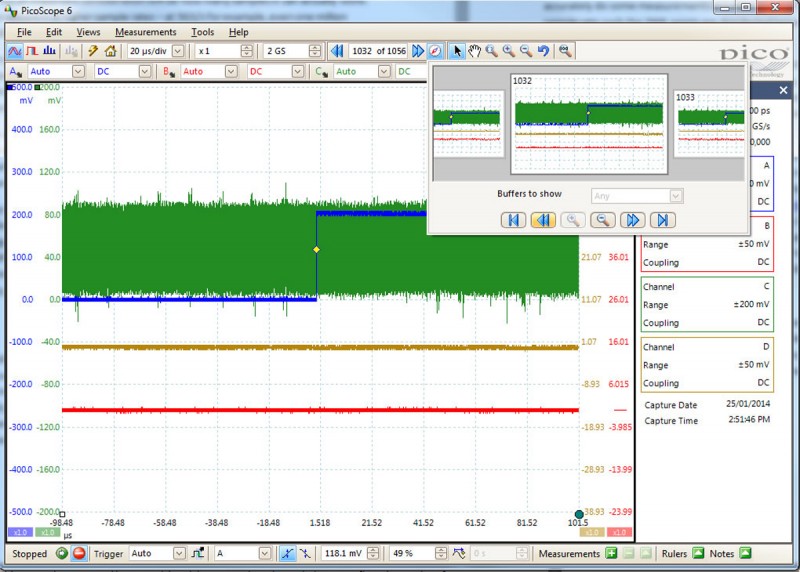 即是一些示波器声称大缓存,但是实际上,我们想要获得全部的缓存也是有困难的。PS6403D示波器是PicoTech的其中一款1GS缓存的示波器,在配套的软件上可以设置示波器的所有参数,但是该软件实际上的将驱动缓存限制在500MS左右。然而我不得不承认这真的是非常让人印象深刻的,直到存储器存满之前,一直能够保持5GS/s的采样速度,就算它建议的存储器带宽是40Gb/s!。借助于分段存储器(这个将来会介绍)我们可以用到全部的缓存,但是它不能用来捕捉一个连续的1GS大小的数据长度。
