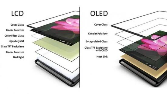 这里不花过多笔墨去谈 LCD 与 OLED 两类屏幕的结构,需要有个基本的概念是:无论是哪种面板,它们都是多层堆叠结构。显示屏分成很多不同的层,每层发挥不同的作用——将这许多层叠在一起就构成了面板和显示屏。LCD 与 OLED 的区别就在构成两类面板的层级结构是大不相同的。