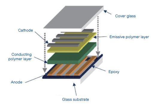 OLED 的屏幕结构此前我们不止一次撰文探讨过,一般的 AMOLED 显示屏,抛开 TFT backplane 不说,主要层级结构包括了基板(substrate),阴极层(cathode)、有机分子层(包括发射层、导电层)、阳极层(anode),如上图所示。这是一个通电就自发光的结构,并不需要额外的背光。