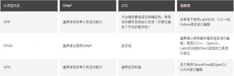 对于大型计算密集型系统而言,拥有可扩展并且可以异构利用同类最佳处理器的硬件架构意义重大。这些架构通常包括用于基带处理的FPGA、用于控制的GPP以及用于AI处理的GPU。GPU既能够处理大量数据,同时也相对易于编程。GPU的缺点是数据管道长,导致传输时间较长,不过这个问题只对需要超低延迟的系统有影响。当然,这两类系统中都有许多设备以牺牲性能为代价来降低功耗,在设计分析中应该对此加以权衡。