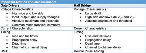 效率和功率密度要求经常会随着应用设计要求变化,如是否要优化性能价格比。在功率密度中改善能效的要求,决定着设计的拓扑结构,进而影响着要考虑的测量设备和技术。表1汇总了半桥和门驱动器最重要的指标和测量。