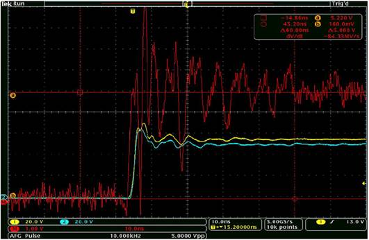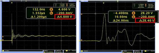 图4. 在这个高压侧门驱动器浮动测量中,明显有振铃、失真和28 V过冲。