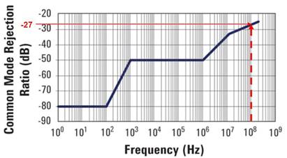 图6. 100 MHz带宽差分探头在频率提高时CMRR额定值下降到-27 dB。